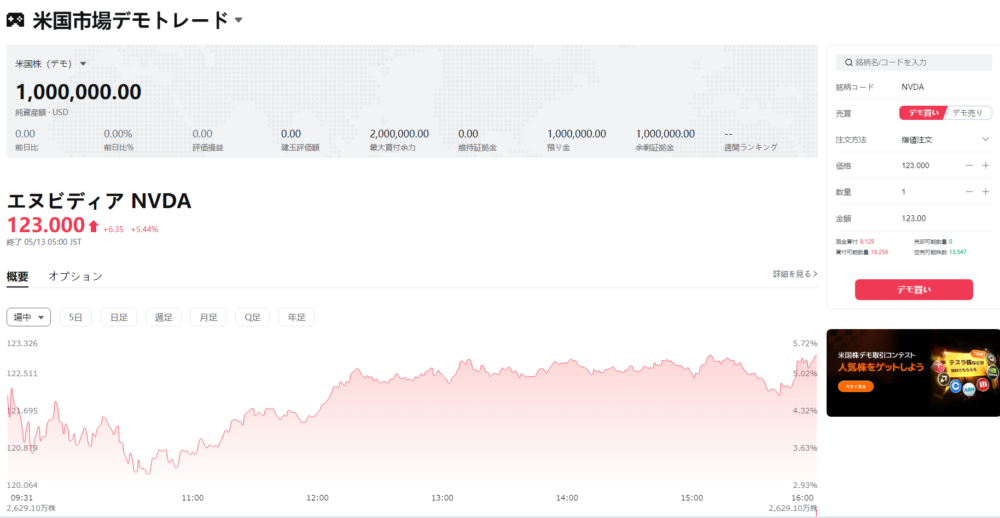 米国株デモ口座:初期資金として100万米ドルが付与されます。