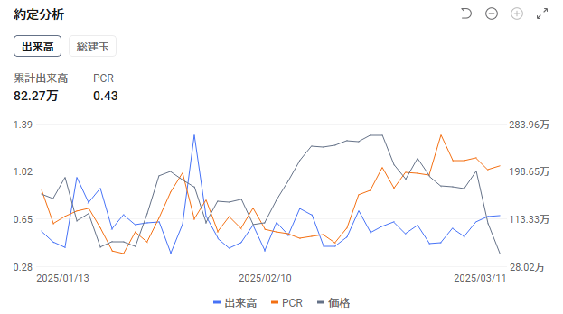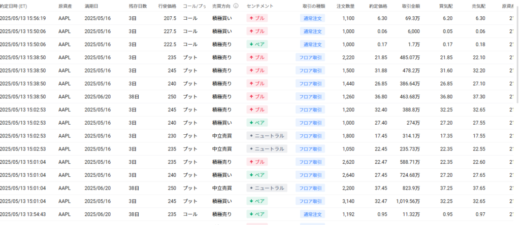 「積極買い」や「積極売り」など、大口投資家のオプション売買動向をアプリ上で確認できます。