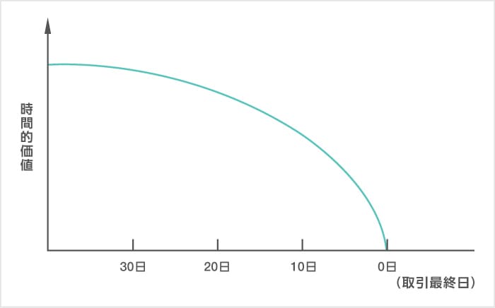 イン・ザ・マネーになればなるほどオプションの本質的価値の割合が増えるた時間的価値は低くなります。