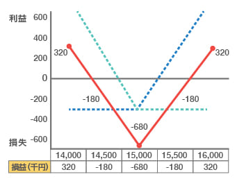 逆に相場の変動が小さいときには損失が発生してしまう仕組みになっていますが、”買い”同士を組み合わせた戦略であるため、損失は限定されます。